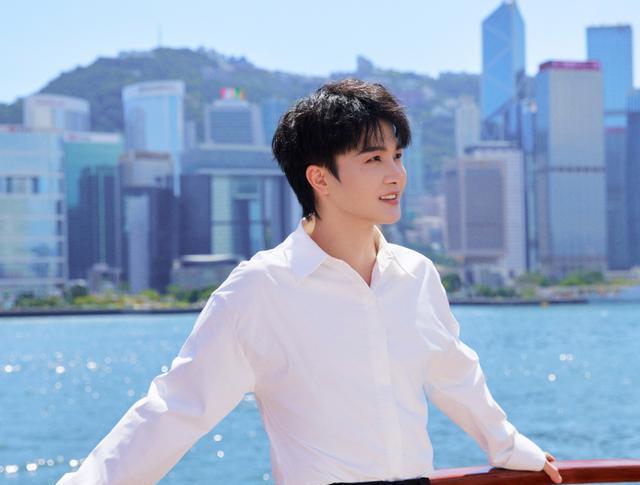 第一张是他站在天星小轮上,穿着简单的白色卫衣搭配黑色休闲裤,戴着黑色鸭舌帽,双手扶着栏杆望向维港对岸,阳光洒在他脸上,嘴角带着浅浅的笑意,眼神里满是惬意,完全没有舞台上聚光灯下的紧张感。